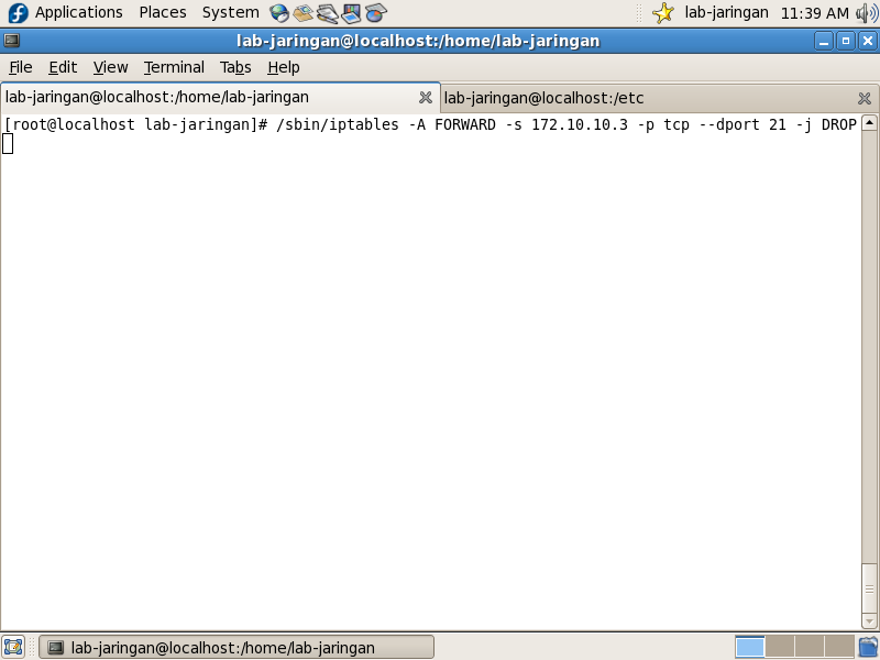 Untuk memblokir protocol TCP (akses FTP), harus menggunakan alamat port yang disediakan. Cara melihat port FTP pada linux, adalah dengan cara masuk terlebih dahulu ke terminal, lalu ketikkan:
